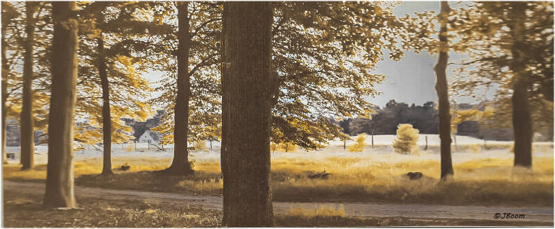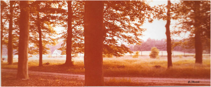 In de Imbosch, natuur vlak bij Eerbeek, ( Christine is geboren in Eerbeek, haar ouders wonen daar, we komen er vaak en genieten dan van de prachtige omgeving.) maak ik een panoramafoto. camera op statief, kleine stukje draaien en nog eens afdrukken. (laten) ontwikkelen en afdrukken, snijden en plakken, blijft altijd een naadje. Digitaal is dat simpel op te lossen.